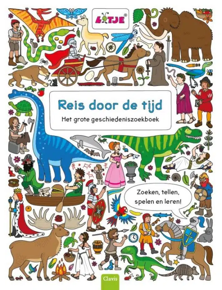 Ga mee op een reis door de tijd en kijk je ogen uit! Zoek tussen de dino’s en de eerste mensen. Speur bij de Romeinen en de ridders. Vertrek met de ontdekkingsreizigers op avontuur en leer spelenderwijs over de geschiedenis. Op elke plaat is van alles te ontdekken. En je leert tellen van één tot tien. Kun je ook overal de blauwe vlinder en de grijze spin vinden?