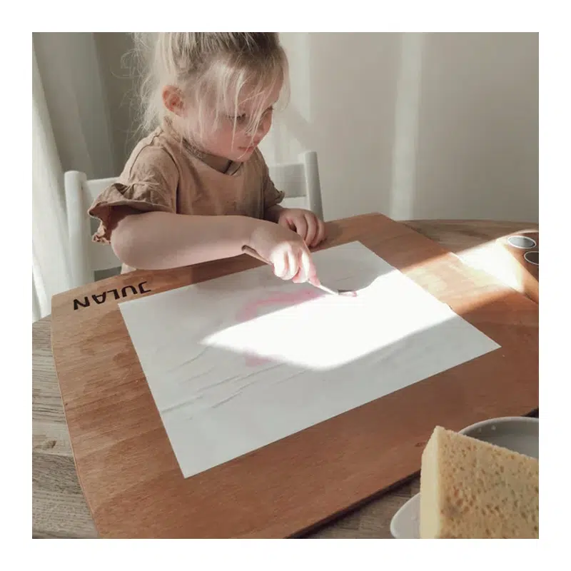 Onze Organisch gevormde teken & schilderplanken bieden een stevig oppervlak om te kleuren, Nat-in-nat te schilderen en te knutselen. De planken zijn aan alle kanten afgewerkt met een hard wax laag die de plank bescherming geeft tegen verf, stiften en krijt. De plank is met een natte doek makkelijk schoon te maken