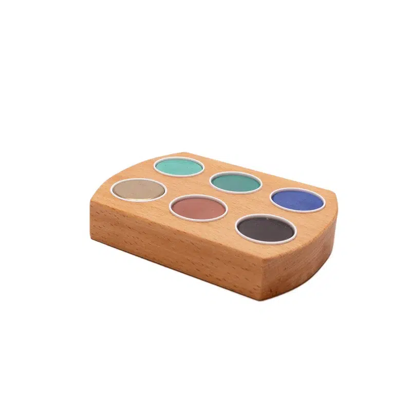 Alle kleuren in een mooi overzicht opgeruid in één houder. De houder heeft gaten van 32 mm waar onder andere Stockmar waterverf cups perfect in passen.
