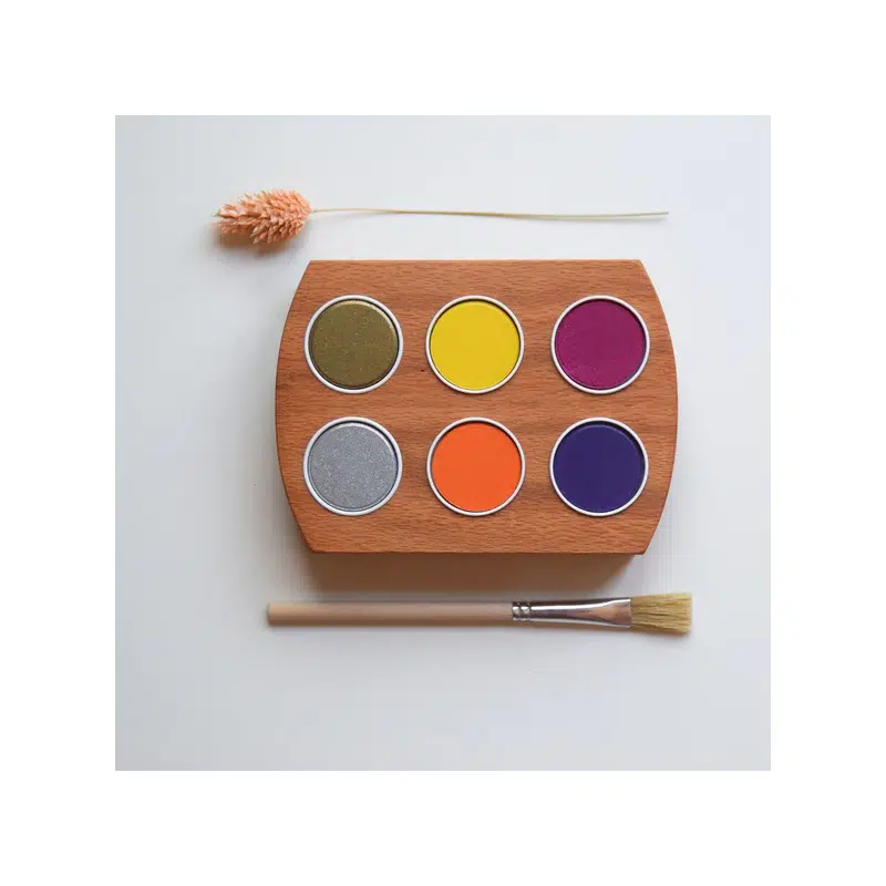Alle kleuren in een mooi overzicht opgeruimd in één houder. De houder heeft gaten van 32 mm waar onder andere Stockmar waterverf cups perfect in passen.