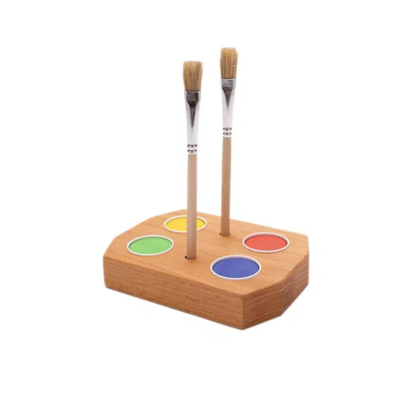 Vier kleuren in een mooi overzicht opgeruimd in één houder. De houder heeft gaten van 32 mm waar onder andere Stockmar waterverf cups perfect in passen.