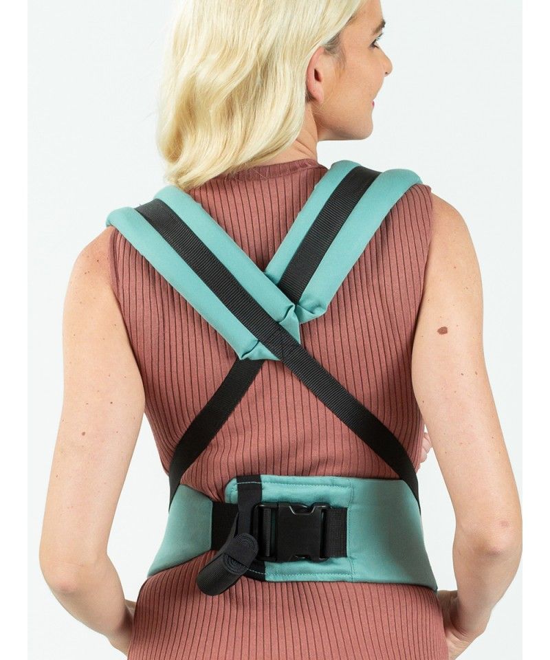 - De schouderbanden zijn ook nieuw en innovatief, ze worden met elkaar verbonden ter hoogte van de taille van de drager, onder het billen van het kind. Ze zijn breed en gewatteerd voor meer comfort.