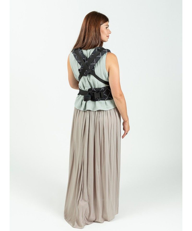 – De schouderbanden zijn ook nieuw en innovatief, ze worden met elkaar verbonden ter hoogte van de taille van de drager, onder de billen van het kind. Ze zijn breed en gewatteerd voor meer comfort.
