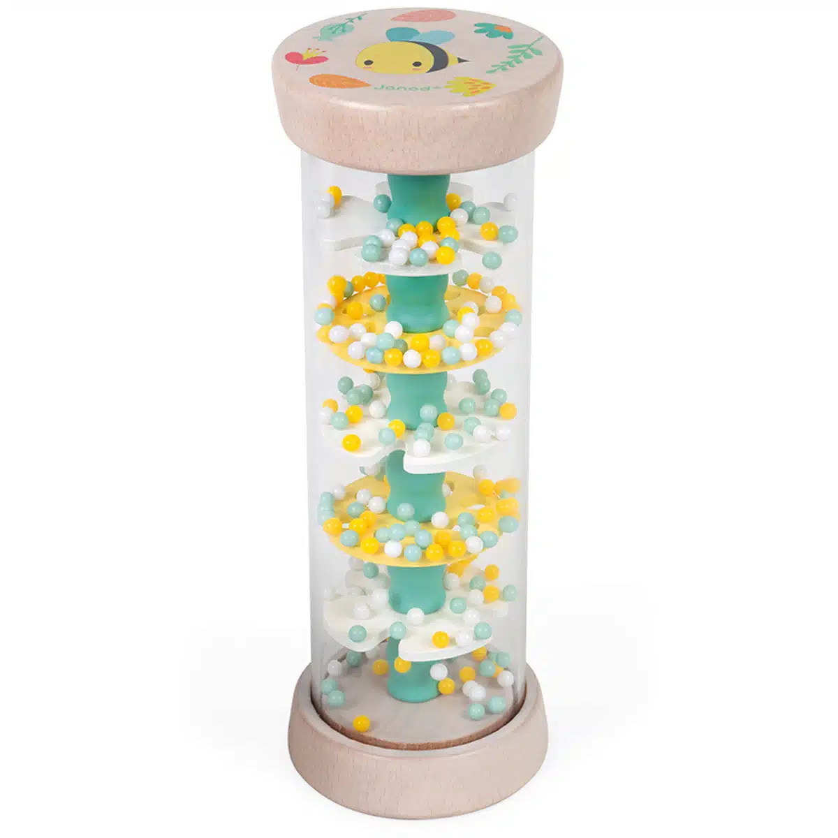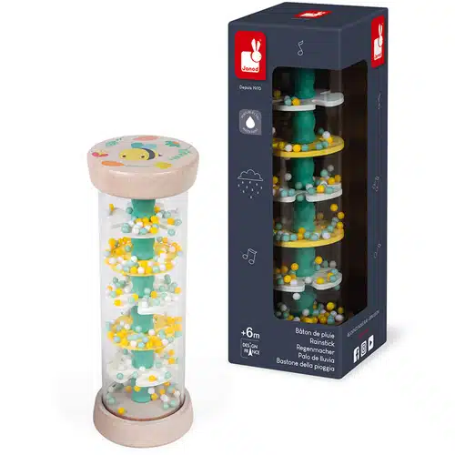 Deze leuke regenmaker vergezelt het kind tijdens zijn muzikale bewustwording en stimuleert de gezichtsscherpte. Draai de regenmaker ondersteboven en de balletjes doen je denken aan het zachte geluid van regendruppels. Zijn ergonomische design zorgt ervoor dat het eenvoudig vast te pakken is, zelfs door de kleinste handen.