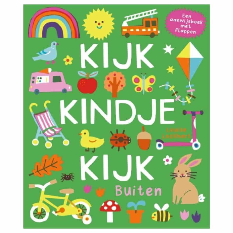 Een aanwijsboek is een leuke manier om woordjes met je kindje te oefenen. In ‘Kijk, kindje, kijk – Buiten’ kunnen kinderen allerlei concepten ontdekken, benoemen en herkennen die ze tegenkomen als ze gaan buiten spelen. Een emmer en een schep bijvoorbeeld, een vogel in een huisje of een schommel en een hond.