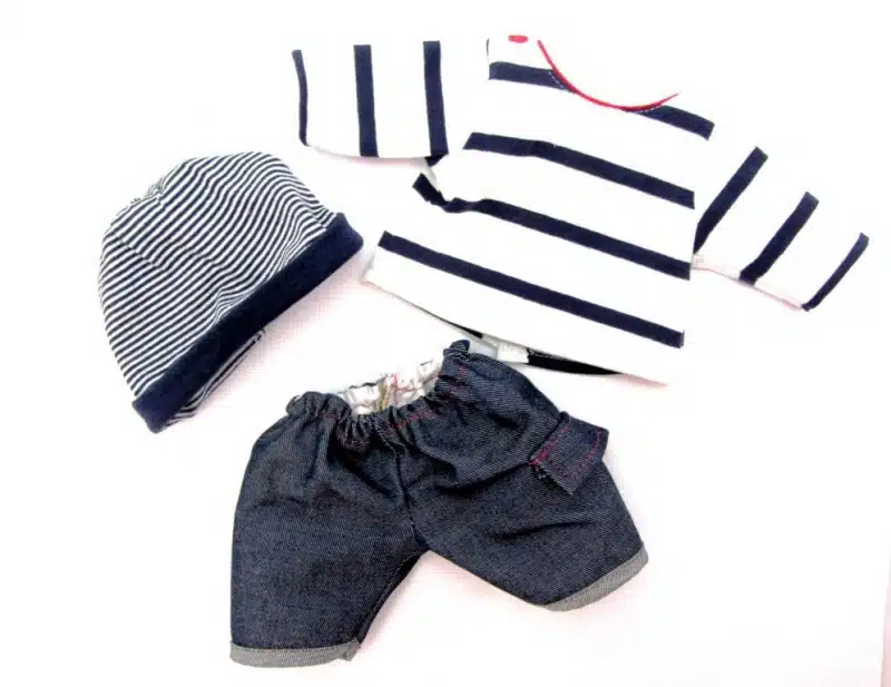 Kleur: donkerblauwe jeans, truitje met Bretonse streep