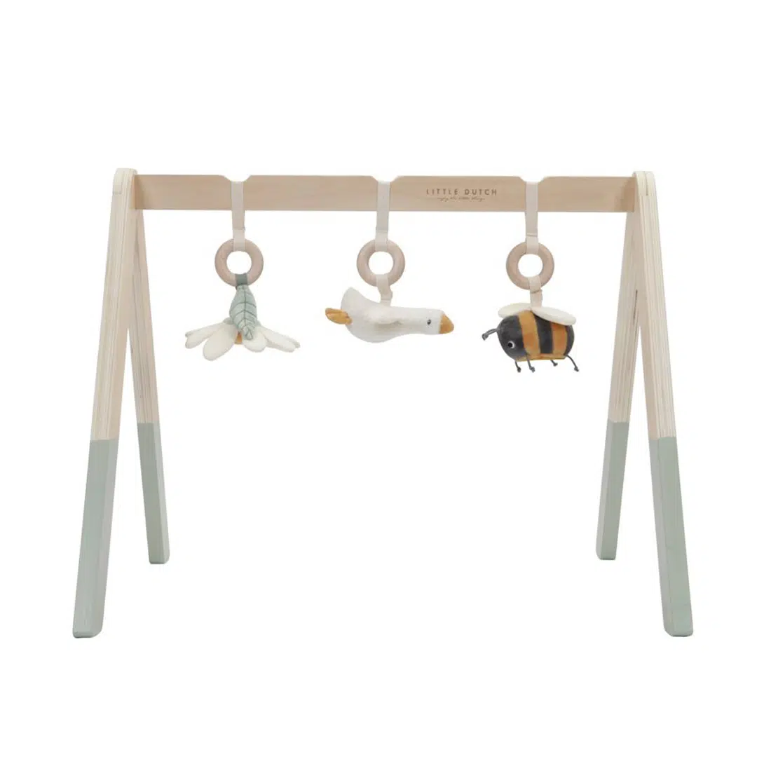 De Little Goose babygym is gemaakt van stevig hout en wordt met drie zachte speeltjes geleverd. Deze vrolijke speeltjes hebben verschillende texturen en stimuleren baby’s om ze aan te raken en te ontdekken. Het bijtje heeft een klein spiegeltje, het gansje is een rammelaar en het bloemetje heeft knisperende blaadjes. De babygym bevordert de hand-oogcoördinatie en prikkelt de zintuigen.