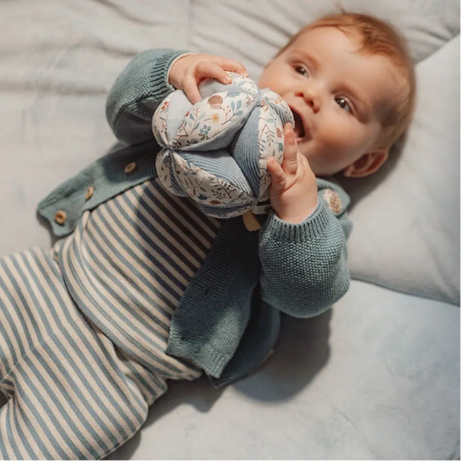 Probeer de bal maar te pakken! Deze grijpbal met zijn interessante vorm zorgt voor een geweldige uitdaging voor je kleintje. De vlakken van verschillende texturen en patronen nodigen uit om te grijpen en te verkennen. De bal is gemakkelijk op te pakken voor kleine handjes en het vrolijke geluid van het rammelende belletje beloont je baby’s inspanning. Op het mooie decor van Forest Friends zullen de makkelijk vast te pakken verschillende leuke labels de zintuigen prikkelen, grip ontwikkelen en je baby flink bezig houden in de box.