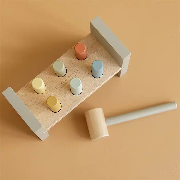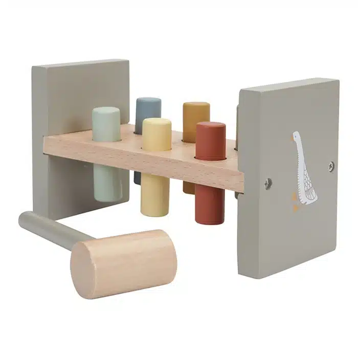 Tik tik tik! Gebruik de hamer om de 6 gekleurde staafjes in het houten hamerbankje te timmeren. Dit is een goede oefening voor de motoriek van je kindje. Zijn alle staafjes erin geslagen? Draai het bankje om en begin op nieuw! Hier zijn ze wel even zoet mee!