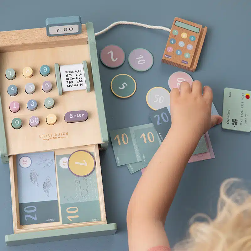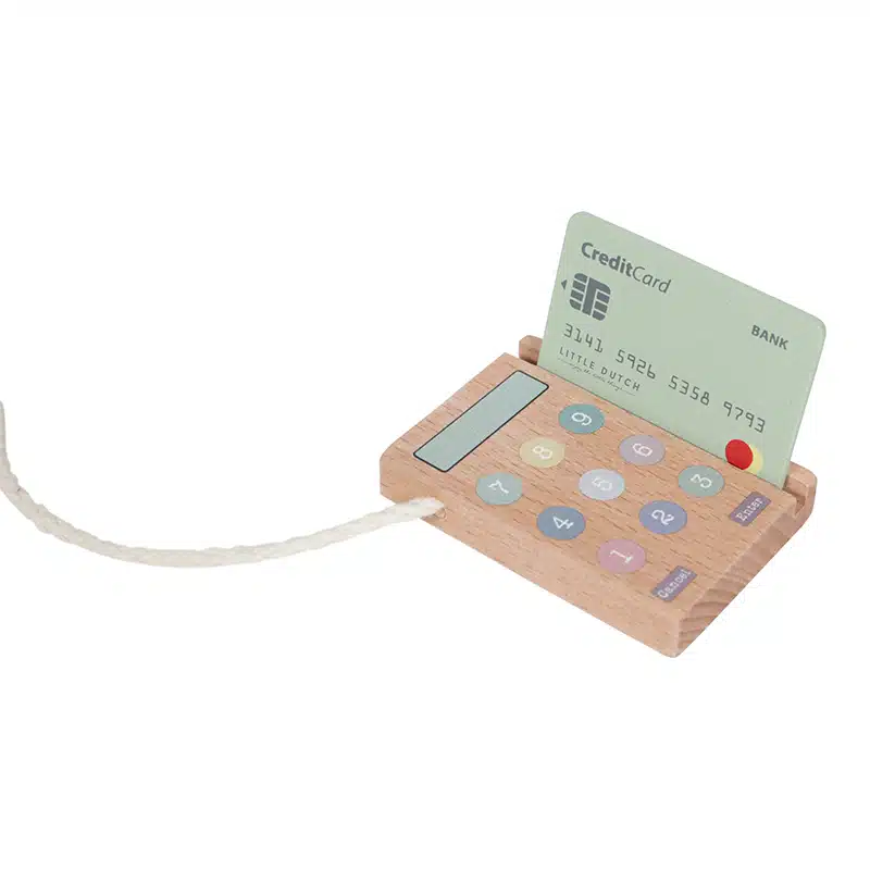 Winkeltje spelen kan perfect met de mooie houten kassa van Little Dutch. De kassa heeft een scanner om alle producten mee te scannen, knopjes om in te drukken en een kassalade met speelgeld. Betalen kan ook met de pinpas en het pinautomaat.