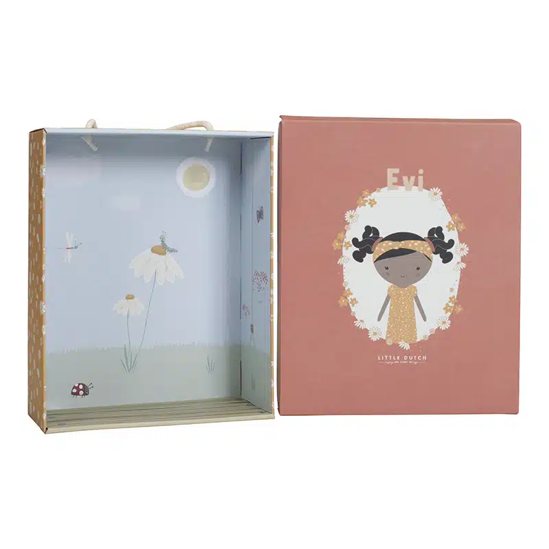 Dit is lieve Rosa. Deze pluche knuffelpop van Little Dutch in een schattig jurkje wil graag geknuffeld worden. Rosa kan rechtop blijven zitten en rijdt graag met je mee in de houten poppenbuggy van Little Dutch.