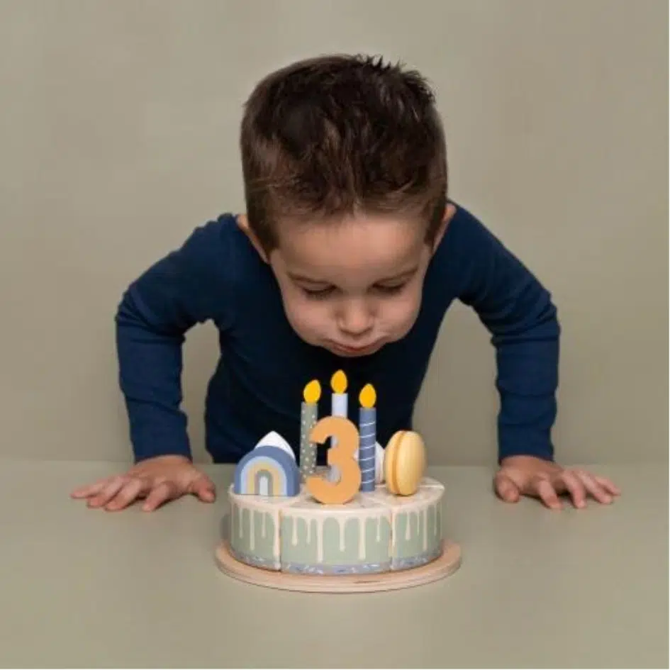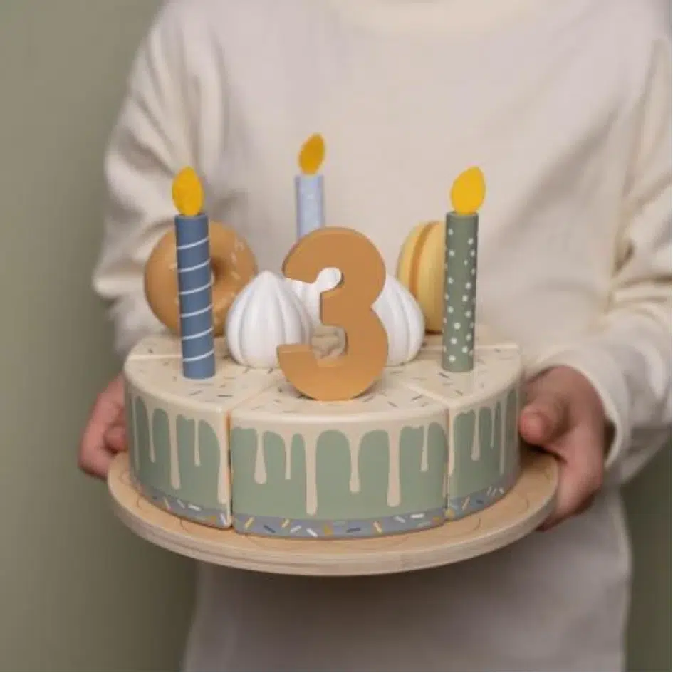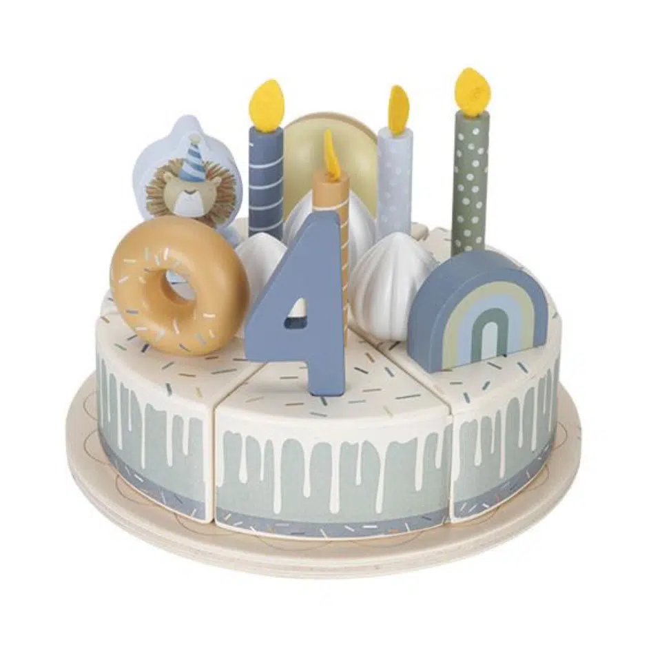 Hieperdepiep hoera! Haal de slingers maar tevoorschijn, want met onze taart is iedere dag een feestje! Versier je taart met een macaron, donut, regenboog, diertjes en slagroom en trakteer alle gasten op een stukje. Veel plezier op het feest. De set bestaat uit zes stukjes taart op een plateau, een taartschep, donut, macaron, vogeltje, vlinder, regenboog, kaarsjes, slagroomtoefjes en cijfertoppers (1-5).