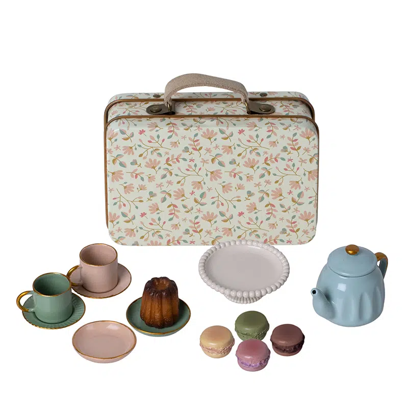 This tea set is the perfect size for a mouse paw. Each set includes all you need for a cosy moment with tea, cakes and tableware. It comes in a metal suitcase, lovely decorated with Maileg print.