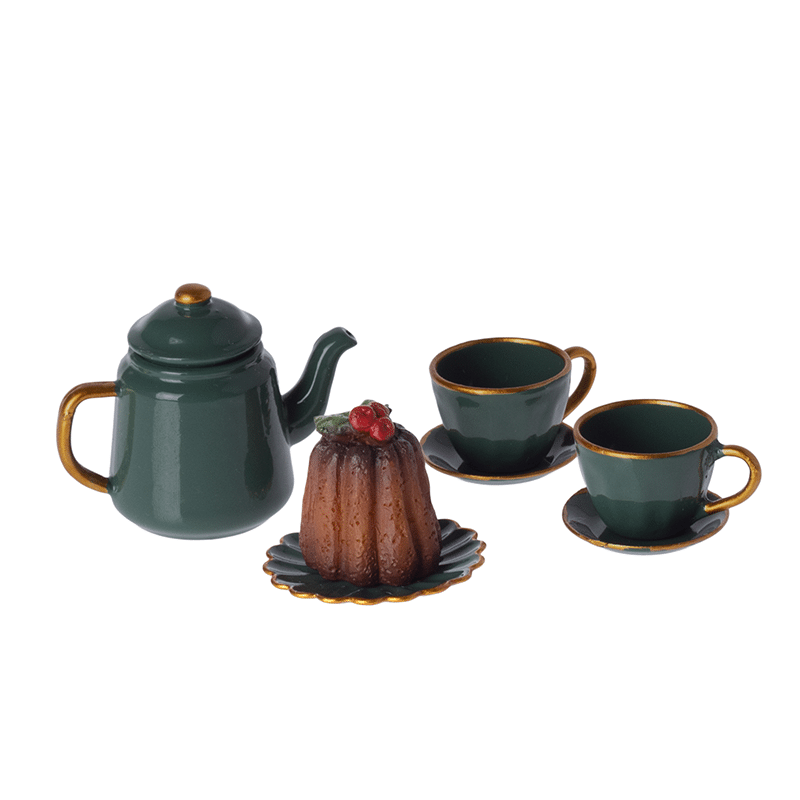 Decorate a cozy Christmas tea table with this lovely set. It is perfect in size for the mouse family. In the beautiful giftbox you find a metal tea pot, two cups, a plate and a deliciously decorated cake made in polyresin.