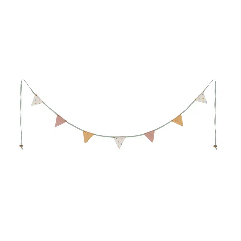 Deze kleine slinger is perfect om je Maileg huis te versieren voor een verjaardag, een feestje, of gewoon zomaar. Het heeft 7 stoffen vlaggetjes.