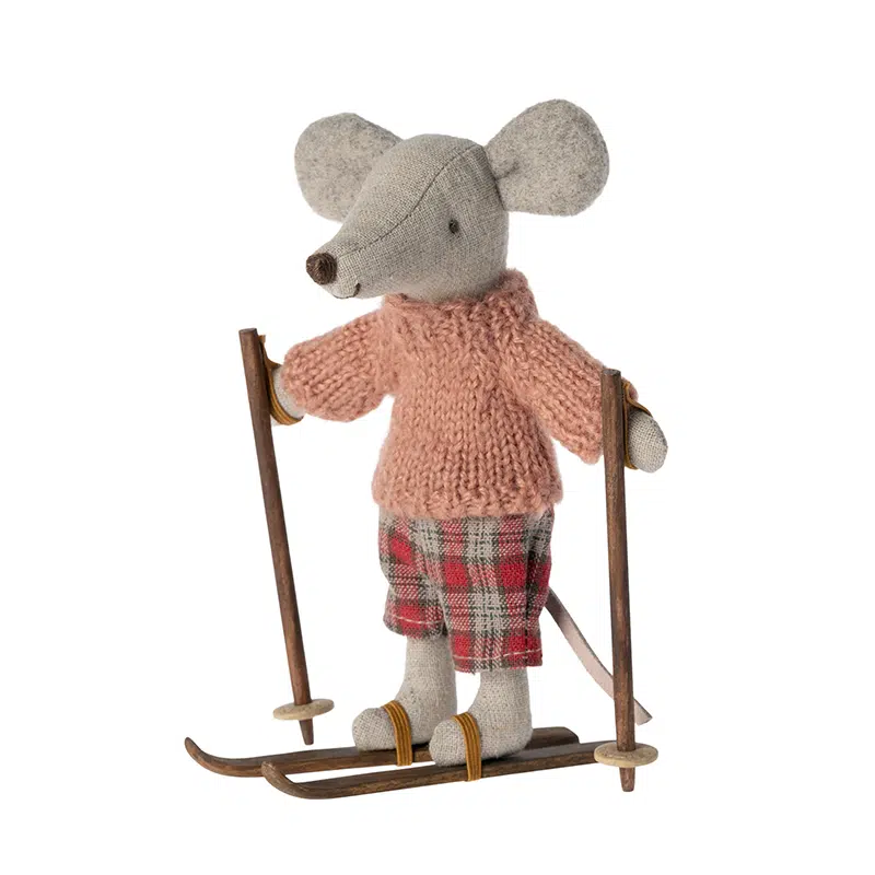 The perfect winter activity in the snow. With this set your mice can have a lovely day on the slopes. Ski and poles are made in wood and the elastic band makes it easy to fasten on mouse feet and paws. Fits size big sister /brother and Elf/Elfie.
