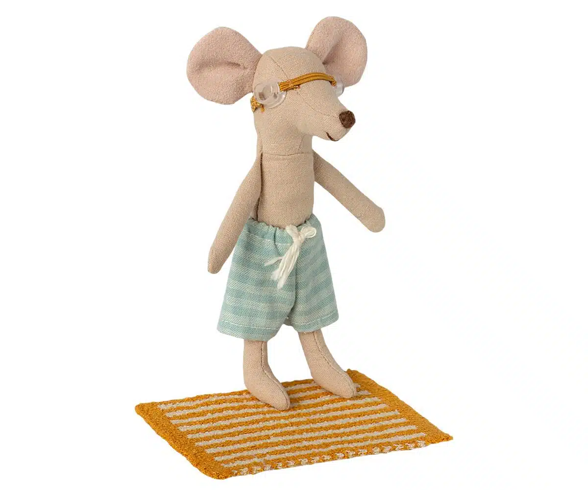 Een leuke strandset voor grote broer muis van Maileg. De set bestaat uit een handdoek, een zwembroek, zwemvliezen en een zwembril.