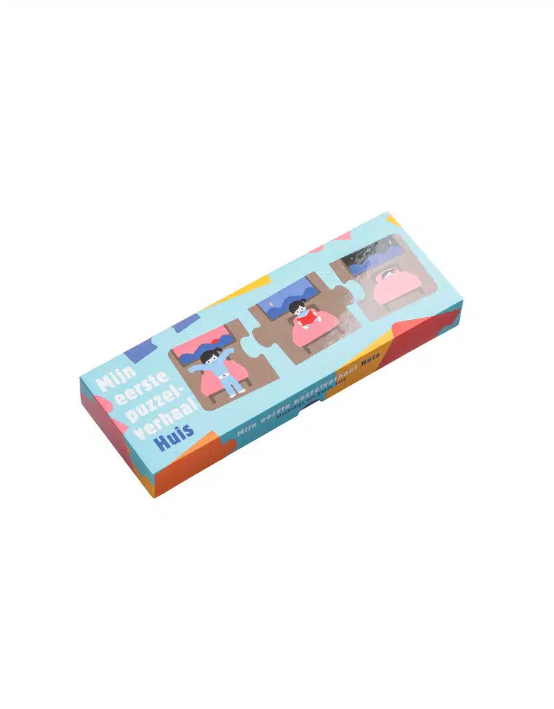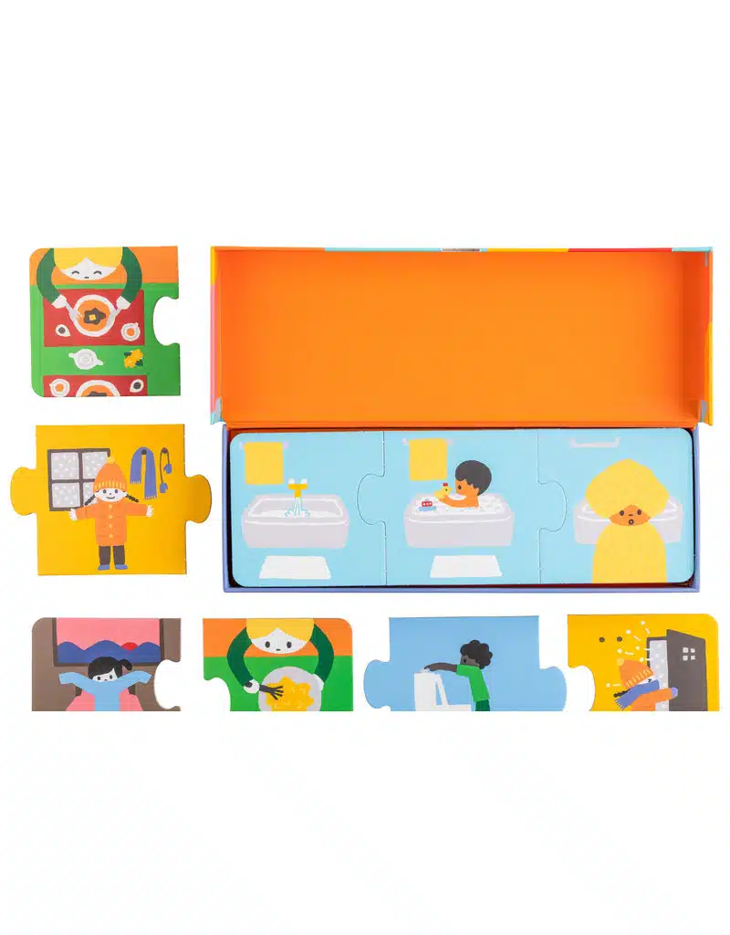 Een kindje trekt zijn pyjama aan, leest een verhaaltje en valt in slaap. Een ander kindje maakt pannenkoekenbeslag, kijkt hoe de pannenkoeken gaar worden en smult ervan! De verfijnde tekeningen van Kanae Sato zijn leuk voor jonge kinderen. Elke puzzel bestaat uit drie stukjes en vertelt een eenvoudig verhaaltje dat laat zien hoe dingen ontstaan. Vijf puzzels met tekeningen die jonge kinderen aanspreken, in een leuke doos.