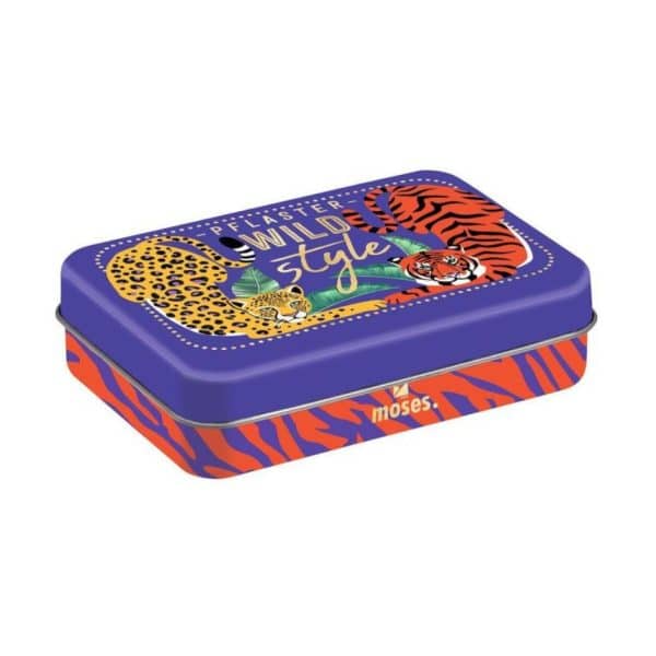 Stoer metalen blik pleisters in wildlife thema met luipaard printjes, 20 pleisters in 2 groottes in 5 verschillende degins, voor jong en oud geschikt, waterafstotend en luchtdoorlatend. Afmeting box: 10 x 2.8 x 7 cm.