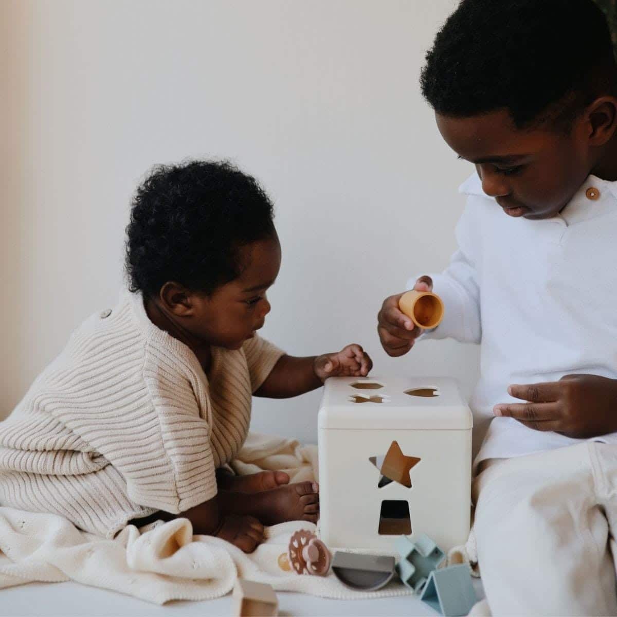 Onderhoudsinstructies voor Mushie Vormensorteerdoos Schoonmaken met warm zeepwater en aan de lucht laten drogen.