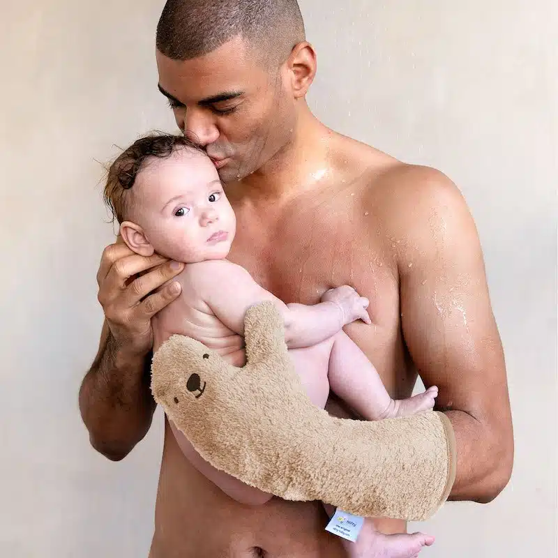 Douchen met je baby wordt nu nog leuker! Zodra de slimfit handschoen nat wordt, vormt ie zich naar je huid en maakt je hele onderarm stroef. Zo heb je meer grip op je baby tijdens het douchen.