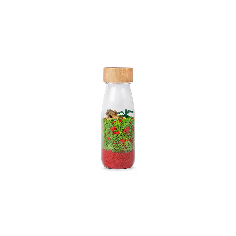 Kijk, zwaai en luister! Stimuleer het gehoor. Discriminatie van geluiden. Stimuleer zicht. Stimuleer aanraking. Klankflessen, een klank- en kleurrijke wereld binnen handbereik. Spelideeën: 1. Observeer de elementen. 2. Schud het en raad de geluiden van elk element. 3. Stapel flessen op elkaar. 4. Rol de fles. 3 maanden of langer.
