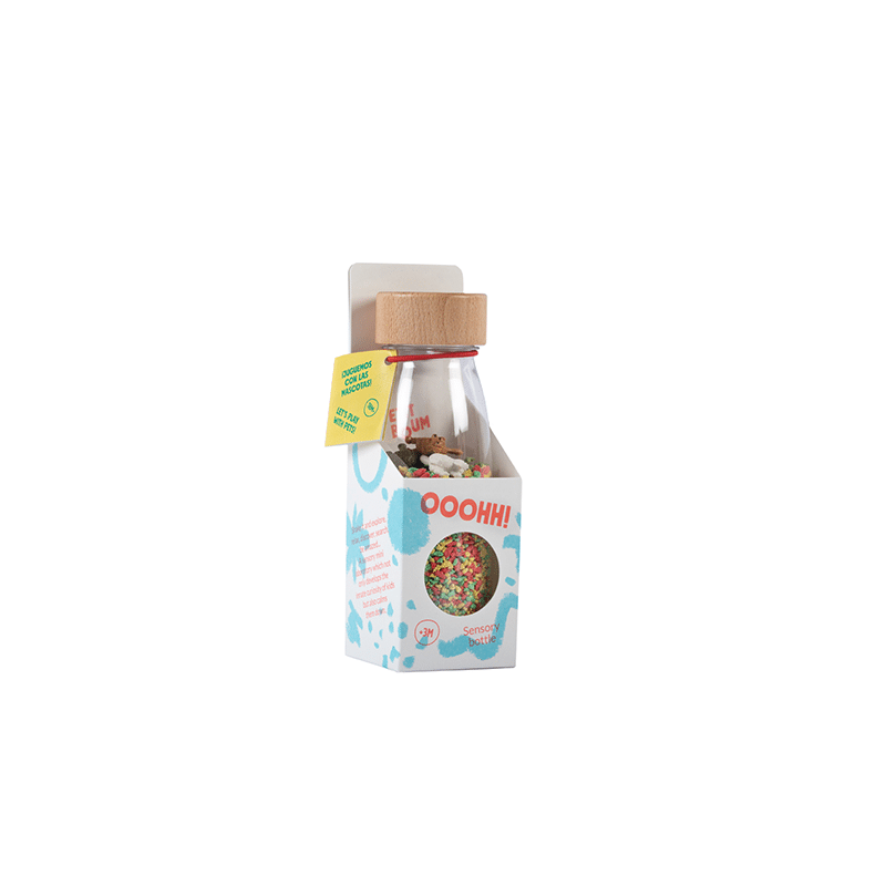Kijk, zwaai en luister! Stimuleer het gehoor. Discriminatie van geluiden. Stimuleer zicht. Stimuleer aanraking. Klankflessen, een klank- en kleurrijke wereld binnen handbereik. Spelideeën: 1. Observeer de elementen. 2. Schud het en raad de geluiden van elk element. 3. Stapel flessen op elkaar. 4. Rol de fles. 3 maanden of langer.