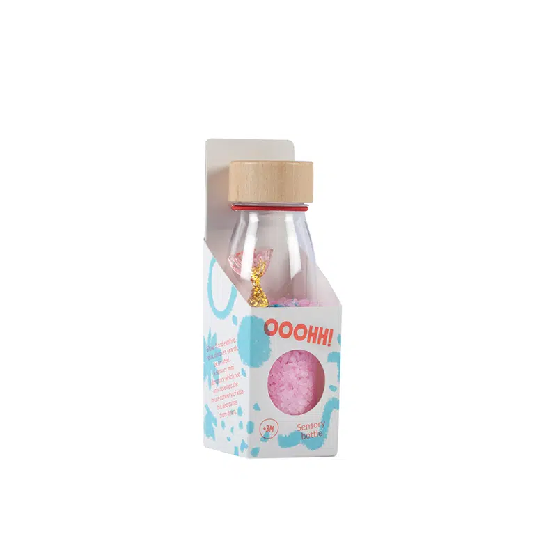 Kijk, zwaai en luister! Stimuleer het gehoor. Discriminatie van geluiden. Stimuleer zicht. Stimuleer aanraking. Klankflessen, een klank- en kleurrijke wereld binnen handbereik. Spelideeën: 1. Observeer de elementen. 2. Schud het en raad de geluiden van elk element. 3. Stapel flessen op elkaar. 4. Rol de fles. 3 maanden of langer.