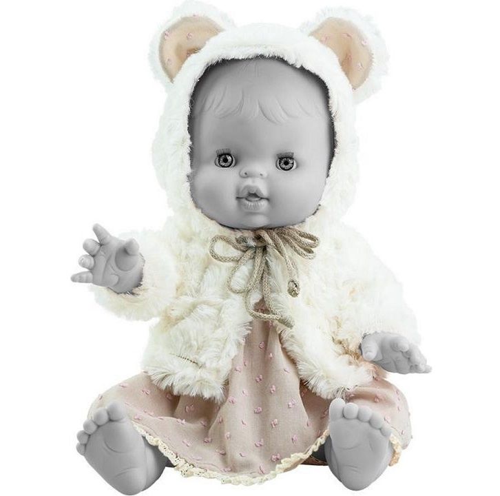 Kleding: jurk (grijs/oudroze), vest met capuchon en oortjes (roomwit)
