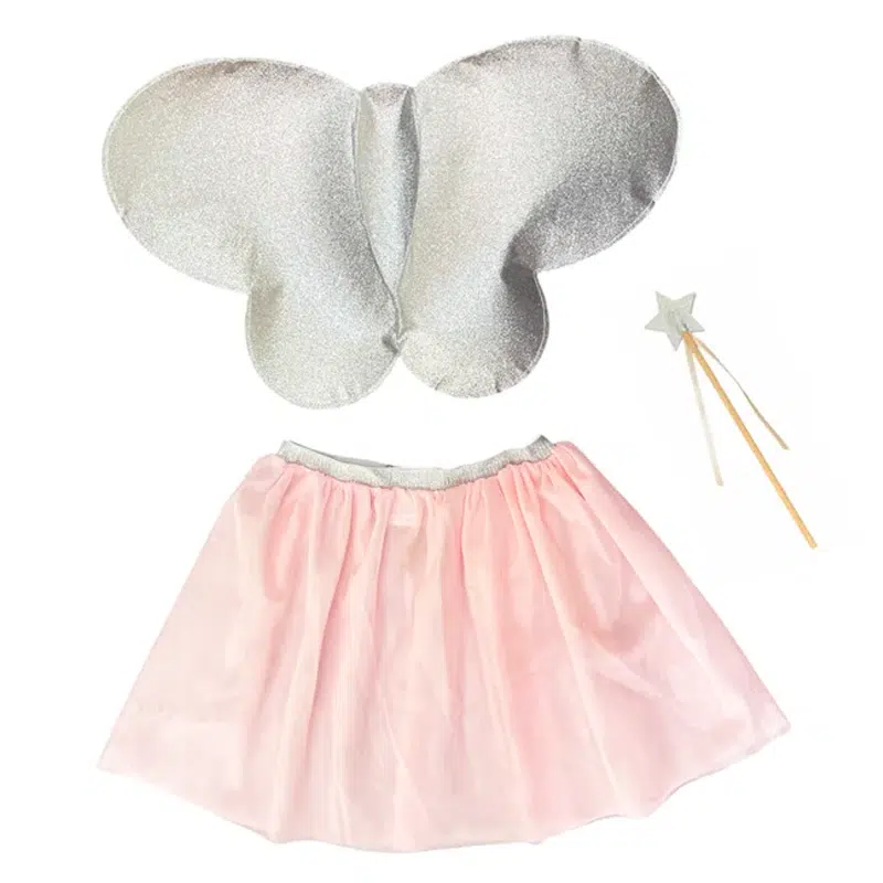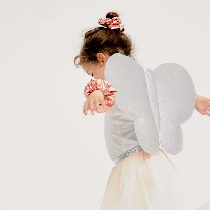 De PAPILLON-kostuumkit, gemaakt door Ratatam voor Smallable, bevat: 1 paar zilveren vlindervleugels met pailletten en elastische bandjes + 1 poederroze tule rok met elastische taille + 1 toverstaf.