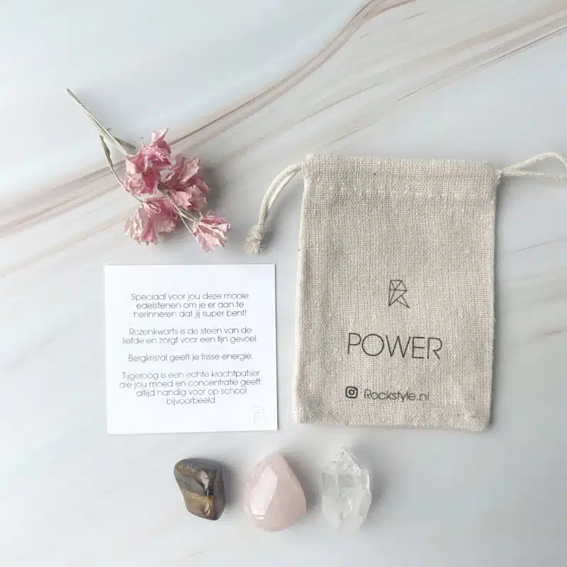 Speciaal voor jou deze mooie edelstenen om je er aan te herinneren dat jij super bent! Rozenkwarts is de steen van de liefde en zorgt voor fijn gevoel. Bergkristal geeft je frisse energie. Tijgeroog is een echte krachtpatser die jou moed en concentratie geeft: altijd handig voor op school bijvoorbeeld.