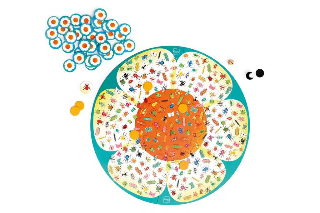 Allemaal beestjes! Op de bloem krioelt het van de insecten. Gooi de dobbelsteen, neem een spelkaartje en probeer binnen de tijd het juiste aantal insecten op de bloem te vinden. Opgepast want sommige insecten lijken heel erg op elkaar en proberen je in de war te brengen! Een superleuk zoekspel voor jong en oud, gegarandeerd uren speelplezuer!