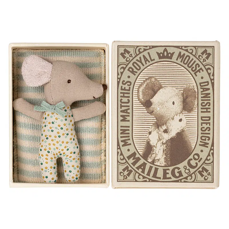 A classic Maileg item. This mouse is ready for hours of play and sleeps tight in the little matchbox. The clothes and bedlinen are made of soft fabrics with unique prints and beautiful colors.