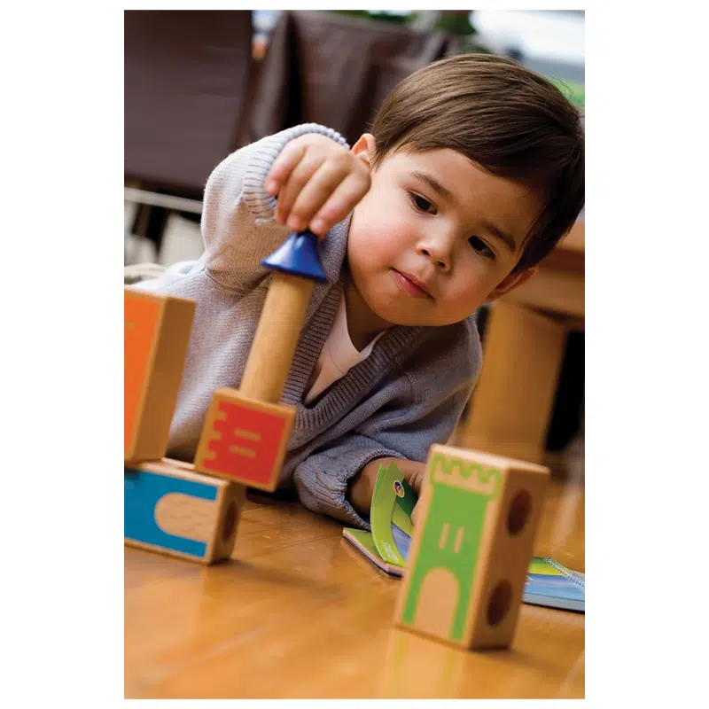 Bouw blok per blok houten kastelen en torens door middel van logisch denken.