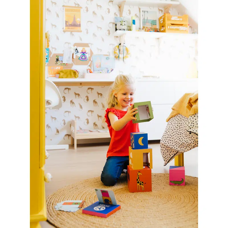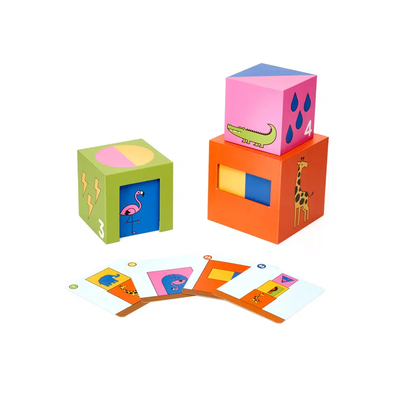 Kies een uitdaging en probeer de blokken te stapelen zoals op de speelkaart. Oefen taal en leer over kleuren, dieren en ruimtelijke concepten zoals op en onder of in en uit. Dit leerzame spel is gemaakt uit kwalitatief, duurzaam karton en is makkelijk op te bergen en overal met je mee te nemen.