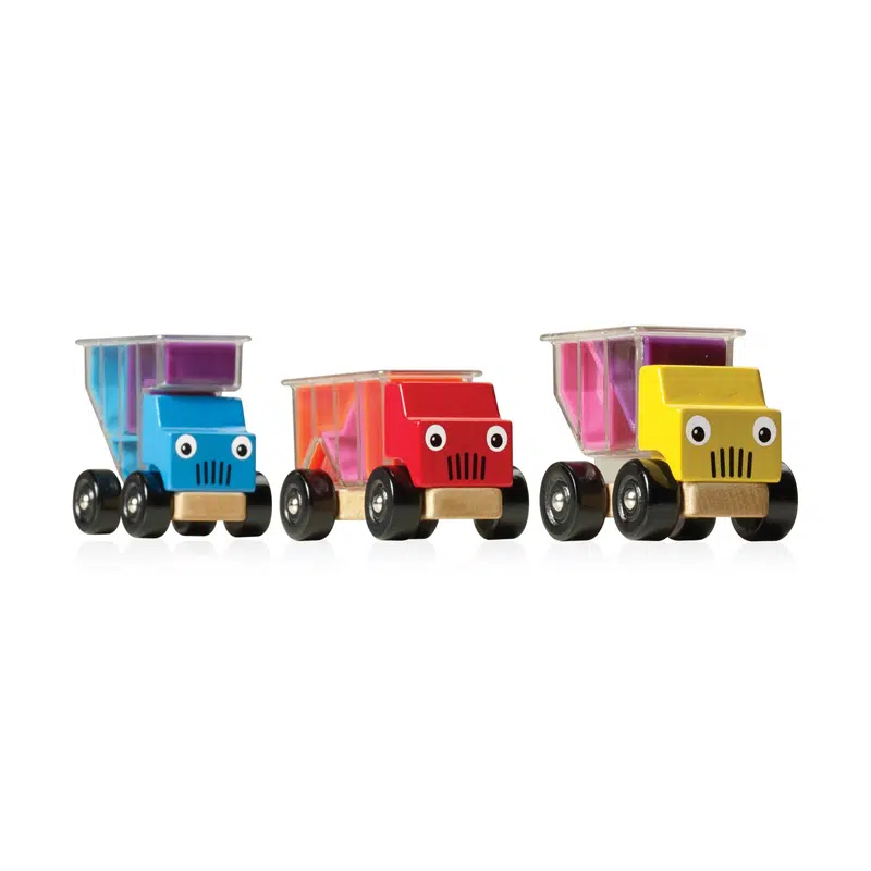 De allerkleinsten gebruiken de vrachtwagens eerst als speelgoedauto’s, die ze kunnen vullen, leegmaken en waarmee ze kunnen rondrijden.