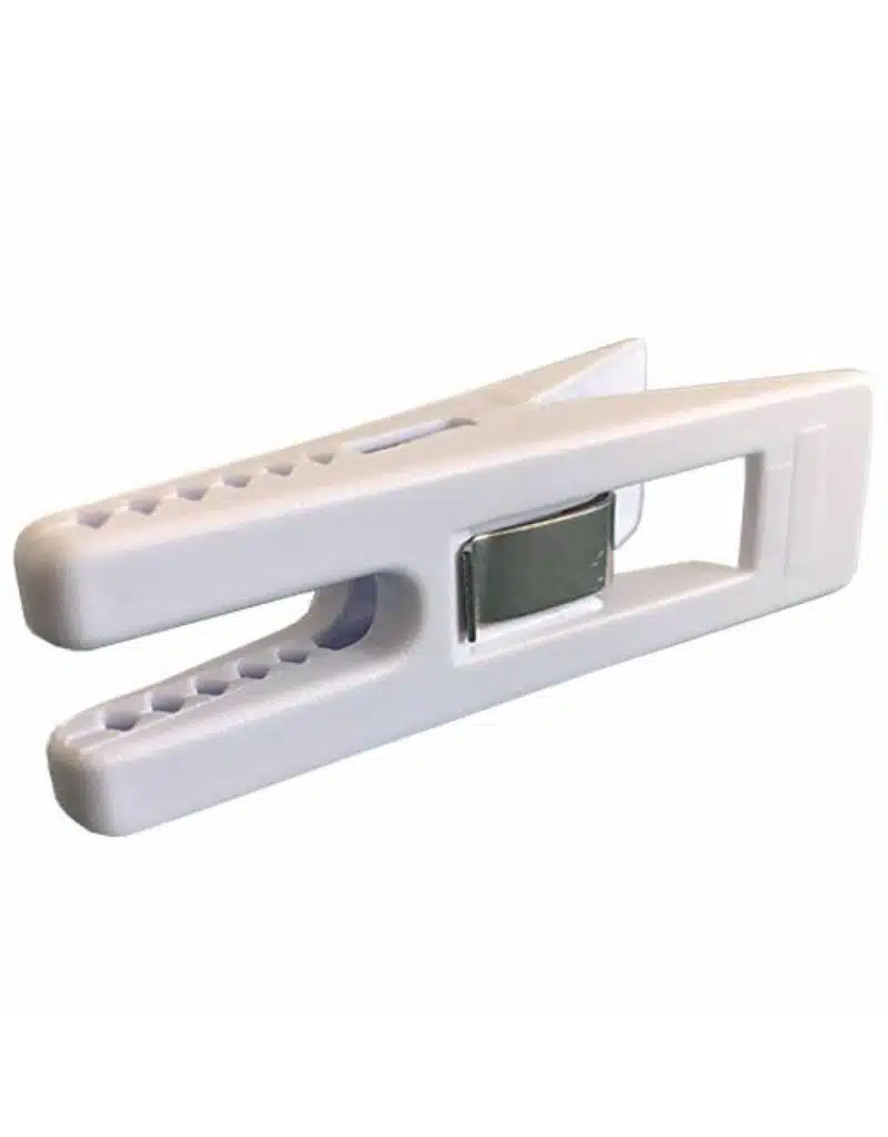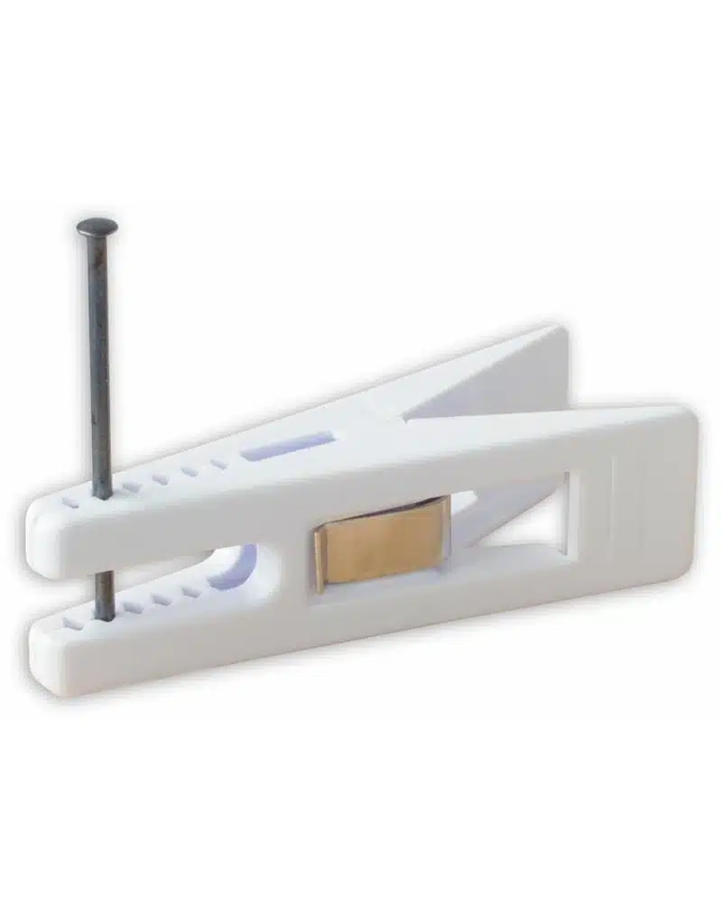 Spijkerhouder, een wit kunststof houder voor het vastzetten van een spijker voor veiig timmeren.