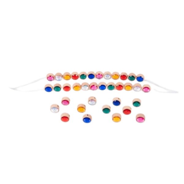 De set bevat 36 juwelen in rood, goud, groen, blauw, roze en zilver (6 van elke kleur), 3 veters en een katoenen opbergtas met trekkoord.