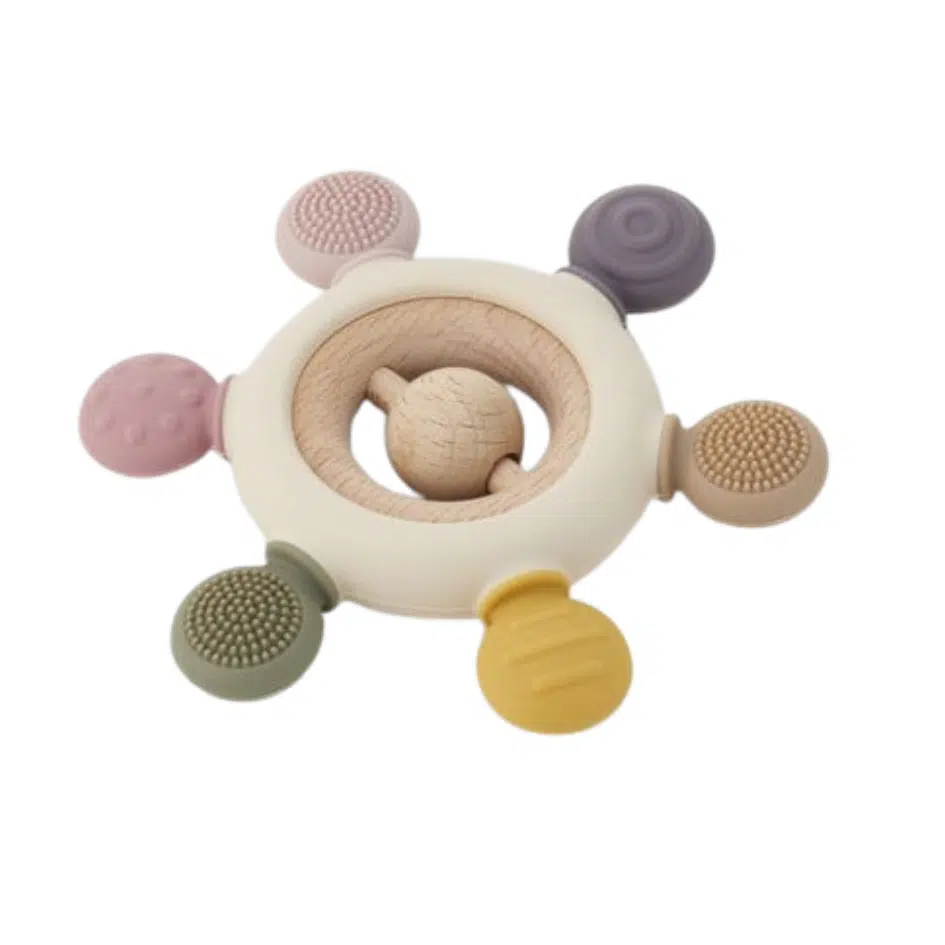 Met verschillende texturen, kleuren en een houten rammelaar in het midden, biedt deze bijtring een leuke afleiding voor jonge baby’s. Het houten rammelgedeelte kan worden verwijderd om het siliconen deel te wassen.