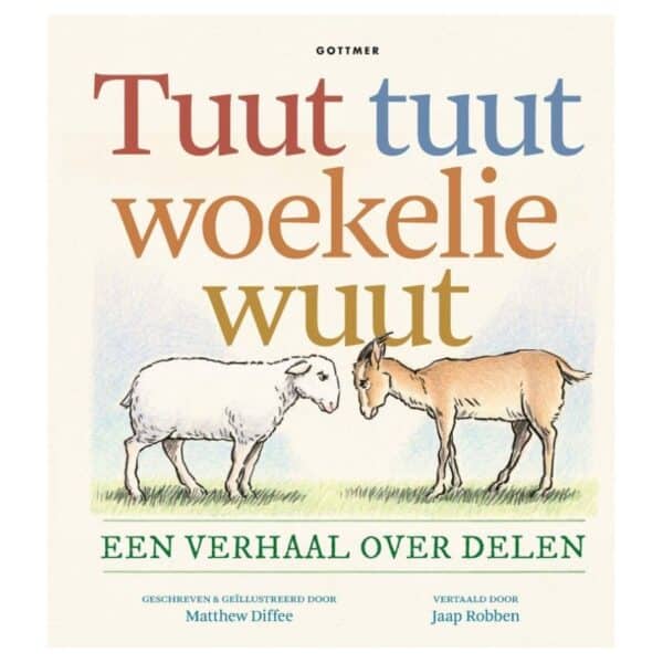 ‘Tuut tuut woekelie wuut’ staat garant voor luidkeelse voorleessessies en leert kinderen ook nog een waardevolle les over delen. De koe zegt boe. Het paard zegt huuhuhuhu. Tot zover geen probleem. Maar als het schaap bèèèh zegt, onderbreekt de geit hem. Want de geit zegt óók bèèèh. Wat nu? Alle dieren willen hun eigen geluid! Na wat geharrewar krijgt het schaap een goed idee: wat als hij iets zegt dat nog nooit iemand heeft gezegd? En zo roept hij uit volle borst: Tuut tuut woekelie wuut wopperdehop klip klop jekkie plekkie pruuuuuuuuut! Helaas blijkt zelfs dát geen uniek geluid, want prompt landt er een alien in een ruimteschip op de boerderij om het geluid te claimen. De alien heeft wel een interessant voorstel voor het schaap en de geit – een oplossing die volwassenen bekend in de oren zal klinken…
